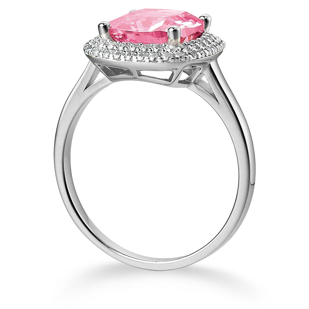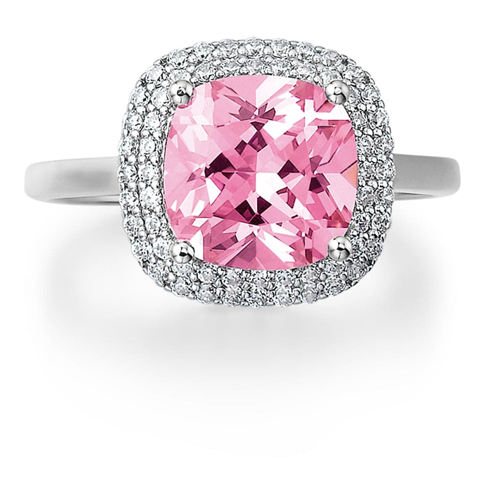 The Pink Josephine Ring features a 5.68ct. Pink Tru-Diamonds™ Cushion-cut centre stone surrounded by ice white Tru-Diamonds™ totalling 6.28ct.