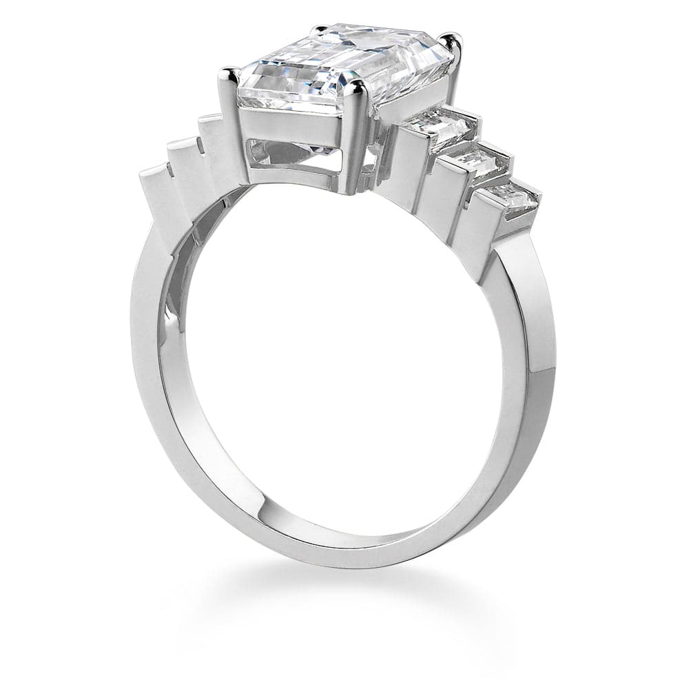 This beautiful ring is inspired by Queen Camilla’s engagement ring. The art deco design features a five-carat emerald cut Tru-Diamonds™ gem in the center and three baguettes on each side.
