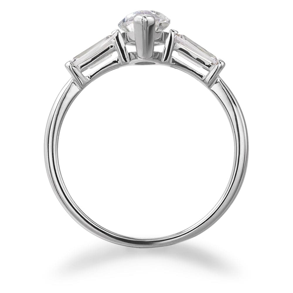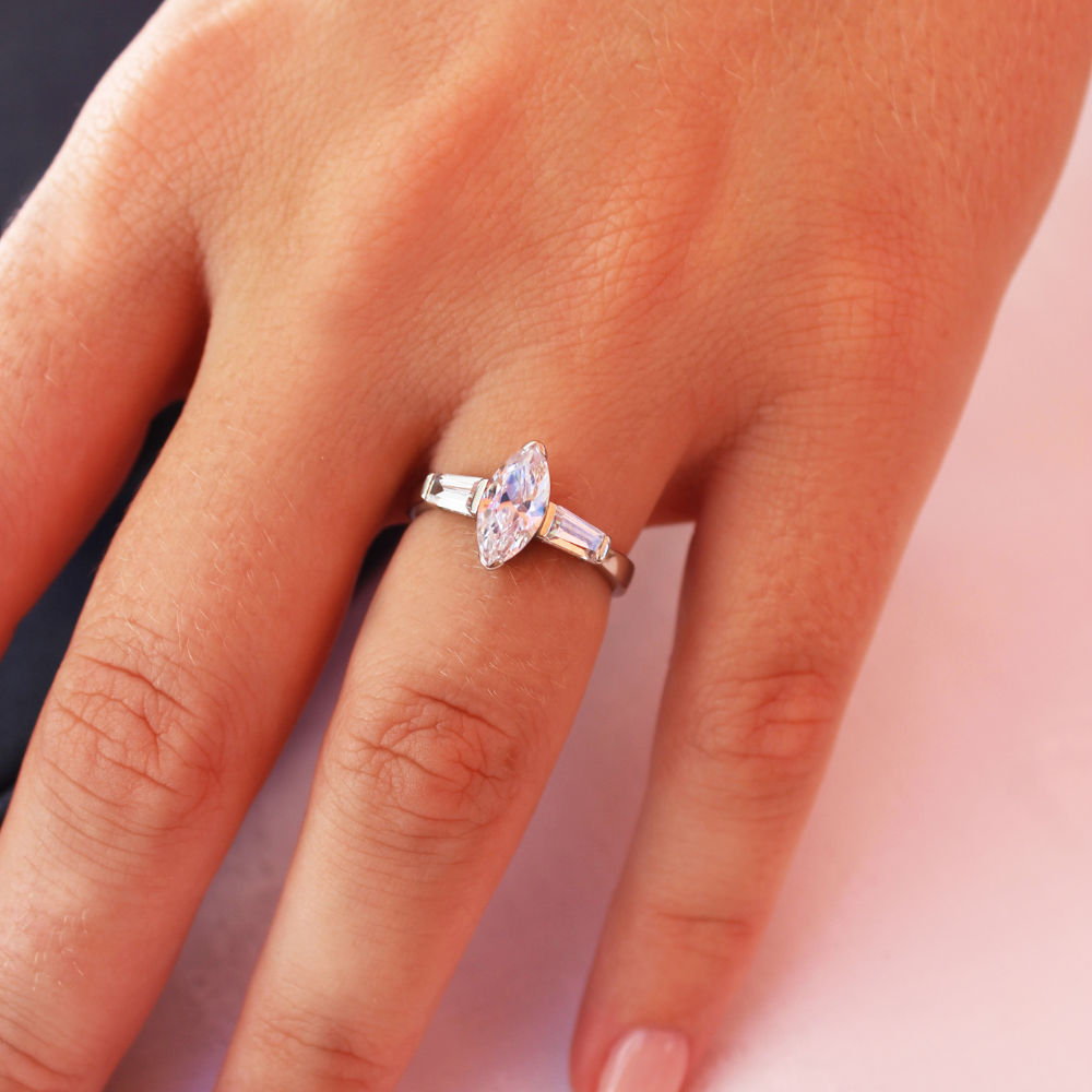 A masterpiece of graceful design and radiant sparkle, the marquise cut centre gem captures the eye with its elongated elegance, creating the illusion of length and refinement on the finger. Flanked by two tapered baguette side gems, the ring exudes balance and sophistication. This trilogy design is the perfect union of timeless style and modern brilliance.