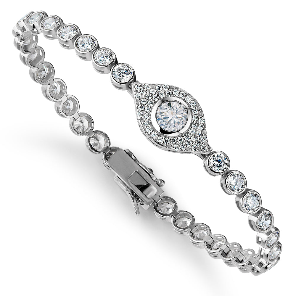 A celebration of refined sophistication, this tennis bracelet features a showcases brilliant Tru-Diamonds™ encircled by a radiant pave setting. Perfectly balanced for everyday elegance or evening glamour.