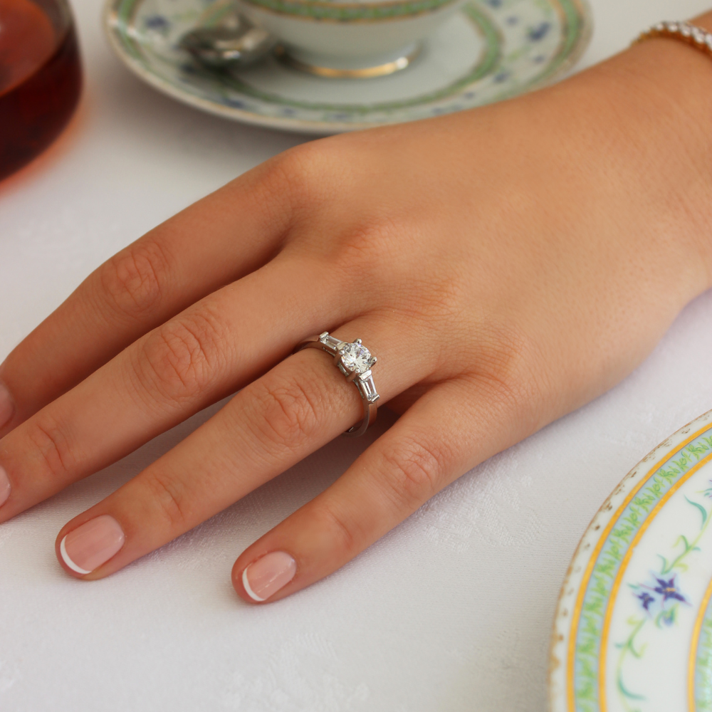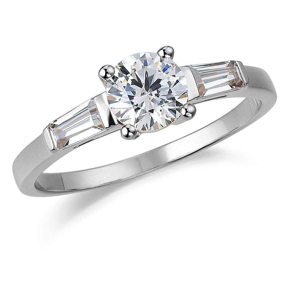 Dazzling and tasteful, our Gala Event Ring with its 1 ct. round brilliant, claw set Tru-Diamonds™ centre gem flanked by channel set baguettes and will be the centre of attraction wherever you go.