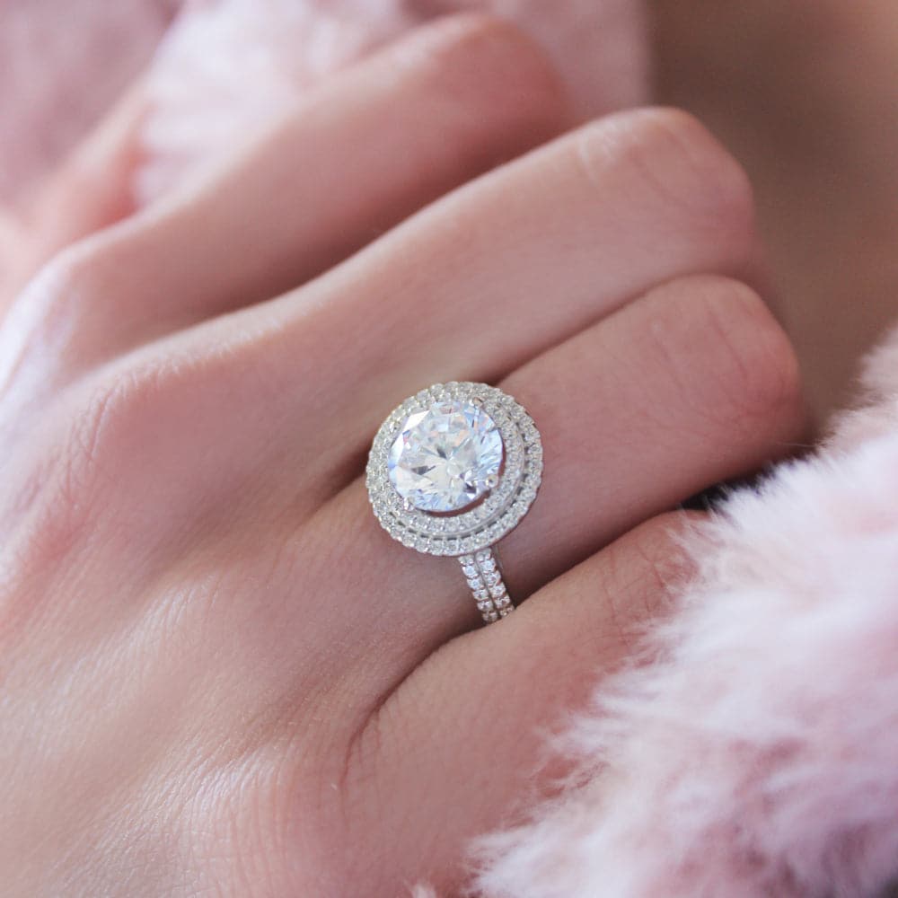 Double the halo, double the sparkle. Our Double Halo Ring features a 2 ct. flawless Tru-Diamonds™ centre gem, surrounded by a double halo, giving it extraordinary brilliance – so expect compliments! It's an ultimate show-stopper!