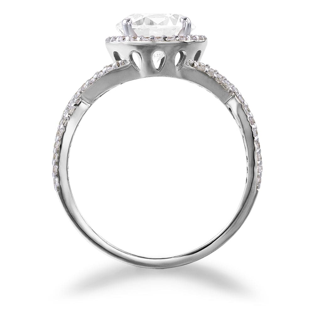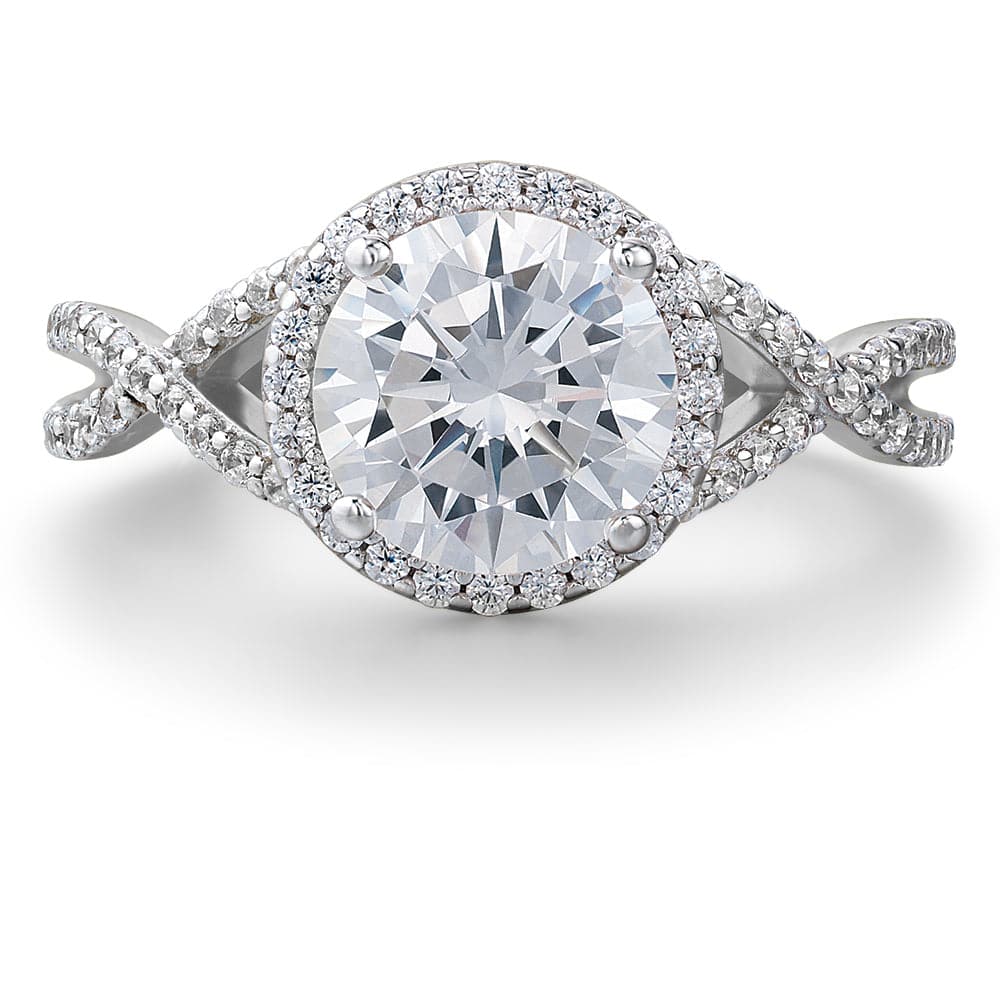 Dazzling and distinctive, this ring captures elegance with a modern flair. A brilliant round-cut centre gem sparkles at the heart, encircled by a radiant halo of pavé-set gems for extra fire and brilliance. The split-shank band, adorned with shimmering stones, weaves into an elegant twist design—symbolising unity, love, and infinity. A truly breathtaking piece for life’s most cherished moments.