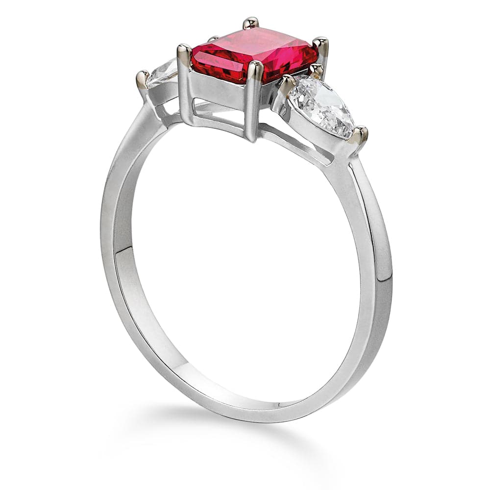 Tru Ruby Radiant and Pear Cut Synthetic Lab Grown Diamond Trilogy Ring