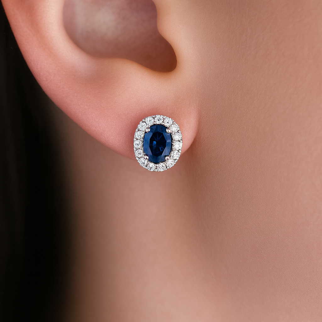 Tru Sapphire Oval Cut Earrings with a Halo of Synthetic Lab Grown Diamonds