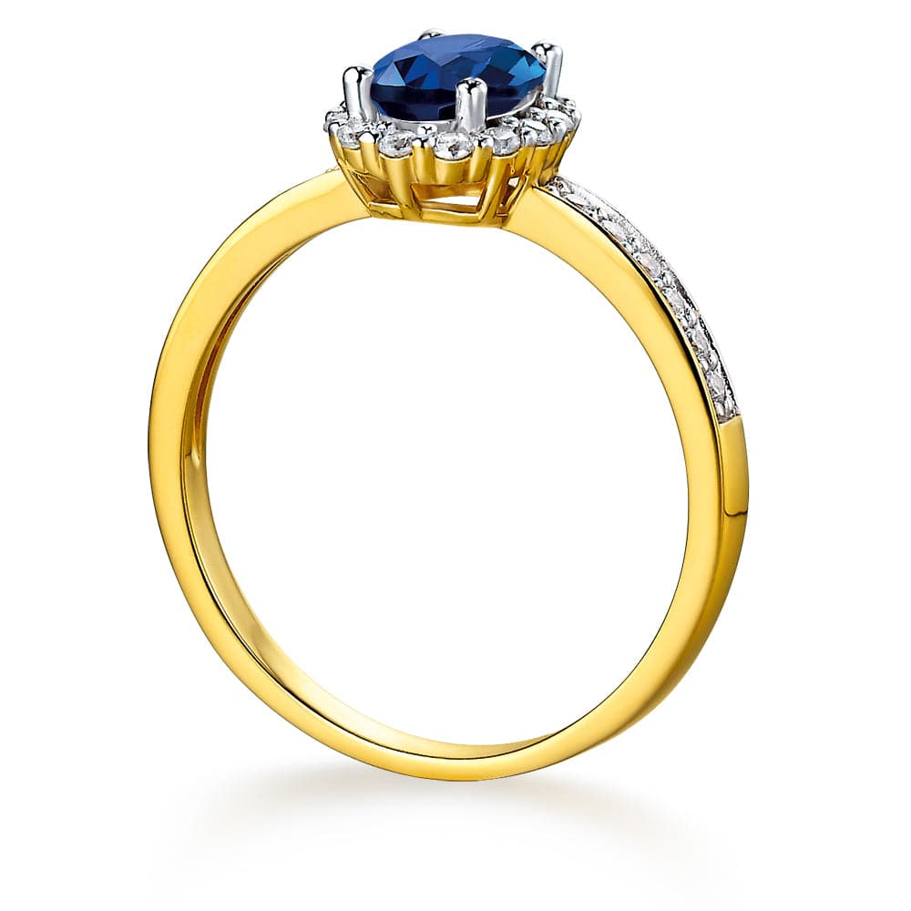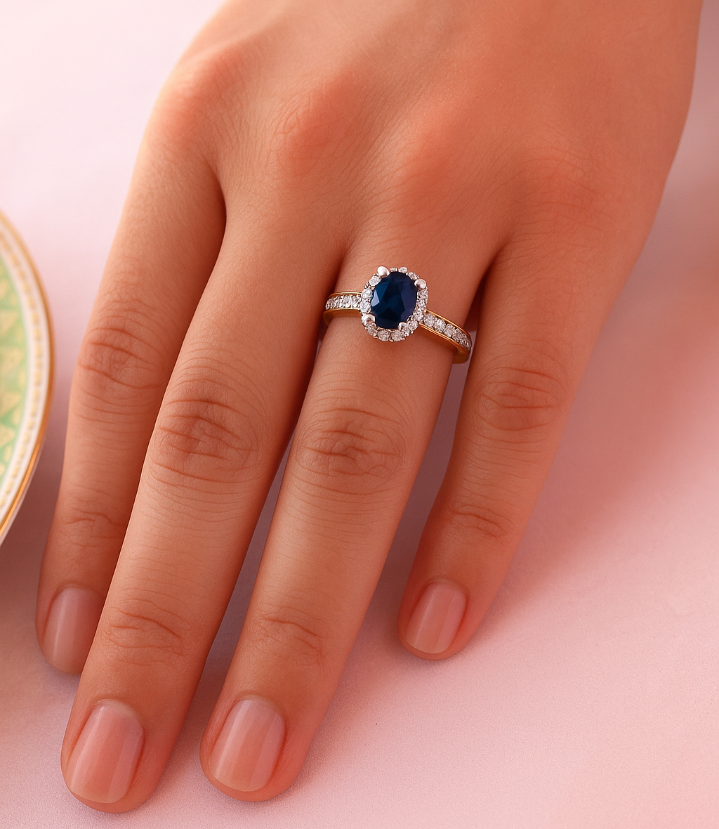 Our timeless Cincature Ring showcases an elegant halo of Tru-Diamonds™ gems framing a larger 1.75 ct. oval cut Tru Sapphire centre gem with a slender, eternity style band completing the design without competing for attention.